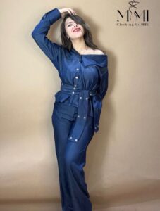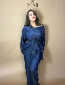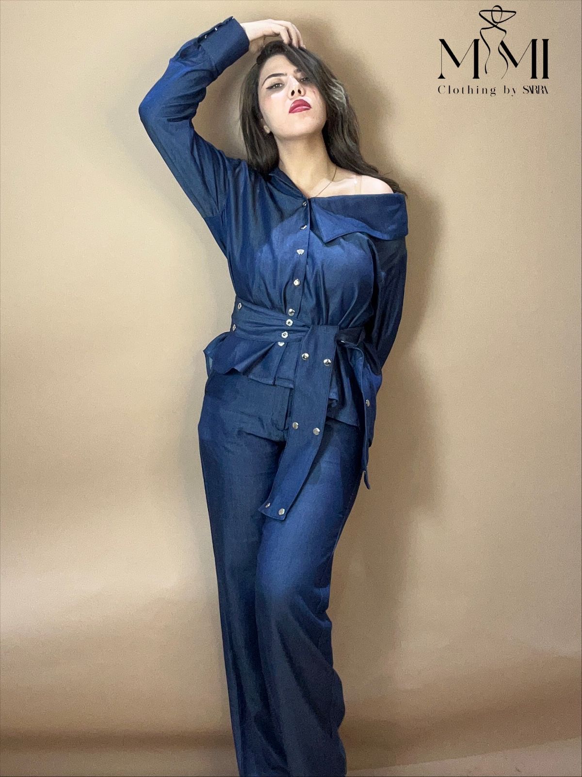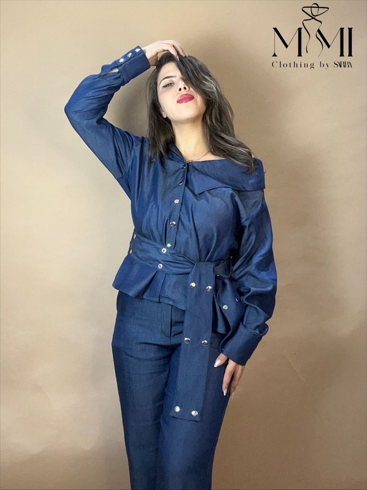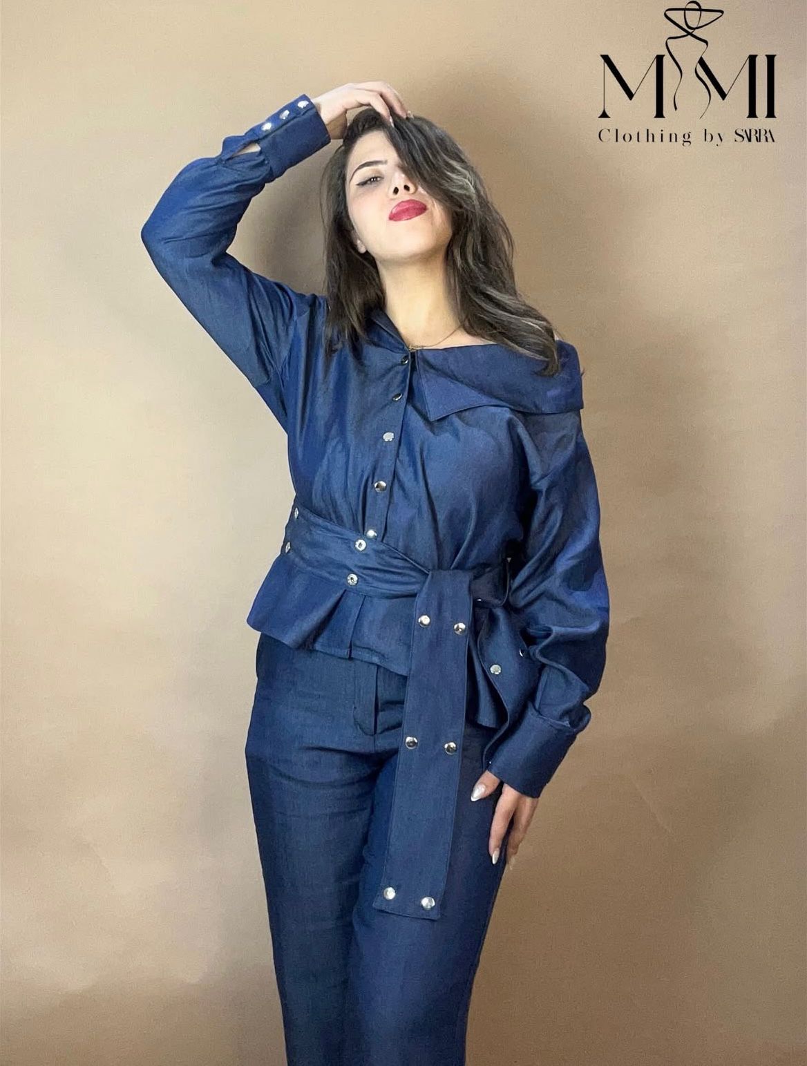 Set Carla en jean bleu, composé d’une veste cintrée avec grand col asymétrique et ceinture à nouer, et d’un pantalon droit taille haute pour une silhouette élégante et moderne.
