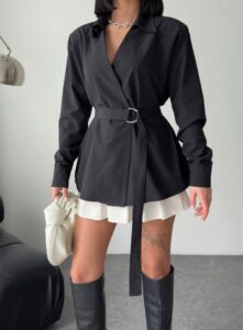 Chemise élégante à coupe structurée, sublimée par une ceinture intégrée qui souligne la silhouette. Son design moderne et raffiné en fait une pièce idéale pour un look féminin et sophistiqué, de jour comme de soirée.